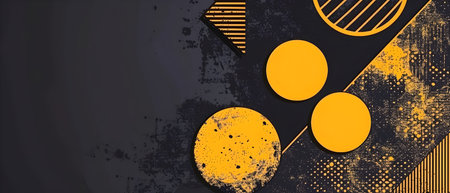 This visually striking image features a dynamic composition of various geometric shapes and lines in a bold modern color palette of black golden yellow and black The design elements including