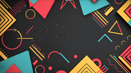 Captivating abstract design with vibrant geometric shapes including triangles circles and lines in a bold minimalist layout on a deep black background perfect for mobile app interface web banners