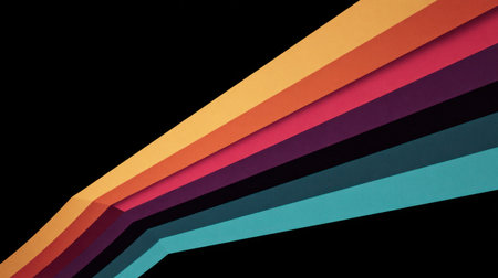 An abstract composition features layered strips in various colors including orange, pink, purple, and blue against a black backdrop. The graphic style employs a geometric approach, utilizing strong lines and angles. This design is suitable for use in digital art, design projects, and visual communication materials.