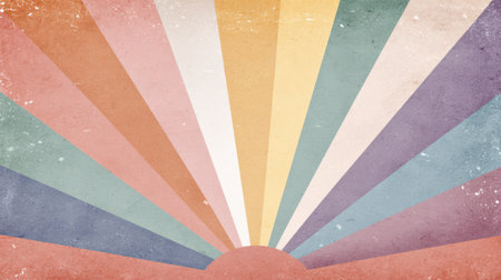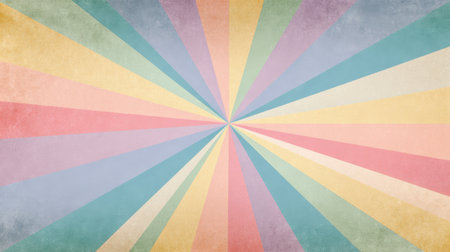 Pastel rainbow retro-style sunburst backdrop with muted tones, gradient rays, and nostalgic vibes perfect for posters