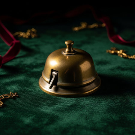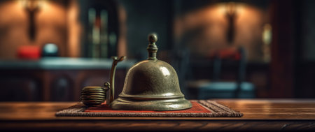 The dark background accentuates the elegance of the vintage hand bell. Creating using generative AI tools