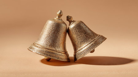 Intricate bronze bells lean against each other on a soft peach backdrop. These charming decorations add a touch of elegance to any festive occasion or decor style.