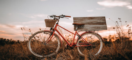 A red vintage bicycle with a wooden sign is displayed in a field, under a soft sunset. The image shows the bike in profile, with white-walled tires. It is lit by warm sunlight creating shadows and highlights, in a natural setting. Suitable for various uses, including marketing and design.