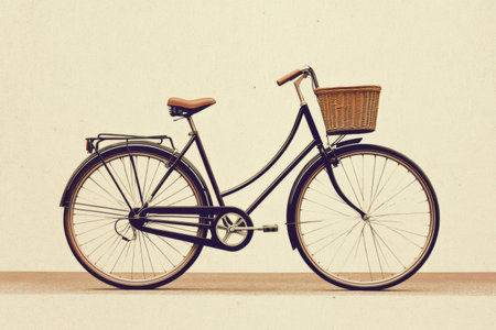 A classic green bicycle with a wicker basket and leather saddle leans against an old weathered brick wall. The vintage bike casts a shadow on the rustic surface evoking a sense of urban nostalgia and eco-friendly transport.