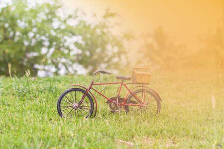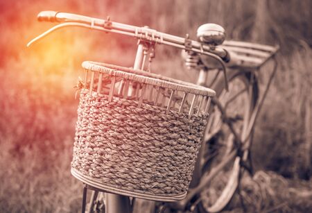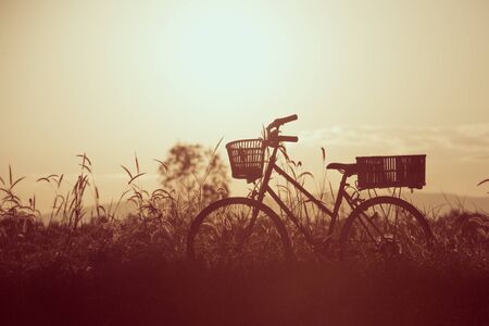 Landscape picture Vintage Bicycle with Summer grass field at sunset ; vintage filter style.classic bicycle,old bicycle style for greeting Cards ,post card
