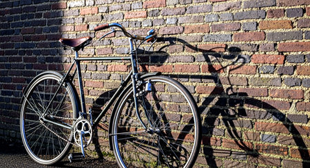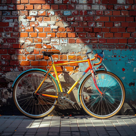 A colorful road bike leans against a weathered brick wall, bathed in the warm, diagonal light of a quiet urban morning.