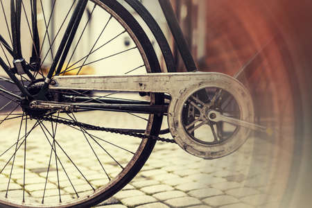 Road bicycle, fixed gear bike on city concrete street. Urban industrial cycling, bike chain on city scene bicycle closeup details, vintage old retro bike, cycling or ecology commuting. Industrial concept.
