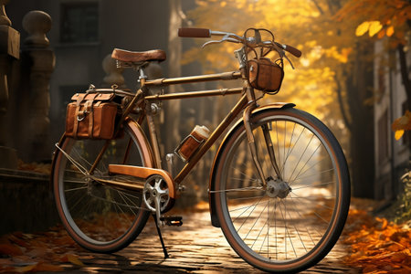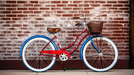 A classic bicycle rests against a textured brick wall in an outdoor setting, likely a street or public space. The image displays a vintage aesthetic with metal frame and leather seat. Soft sunlight bathes the scene, highlighting the details. Suitable for commercial projects or editorial use.