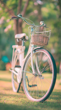 A white bicycle stands elegantly on the grass in a vibrant park. The sun casts a warm glow over the scene, highlighting the vintage wicker basket attached to the front.