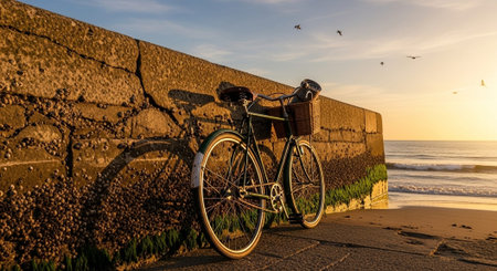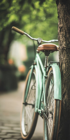 A close-up shot of a vintage bicycle parked against a rustic wall, highlighting its intricate details and evoking a sense of nostalgia in urban mobility.