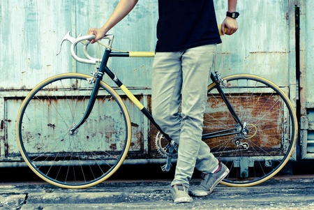 Road bicycle, fixed gear bike on city concrete street. Urban industrial cycling, garage door or gate on city scene bike closeup details, vintage old retro bike, cycling or ecology commuting. Industrial concept.