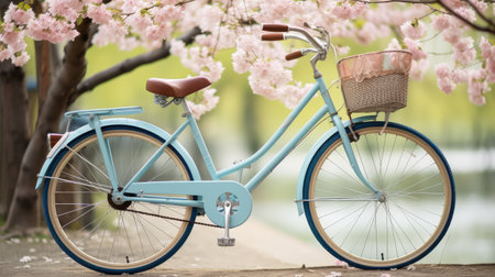 A charming vintage bicycle stands against a backdrop of pastel pink and blue walls, creating a playful and lively urban scene. This image embodies joy, leisure, and aesthetic appeal.