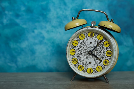 Retro alarm clock on wooden table on blue background. Time concept