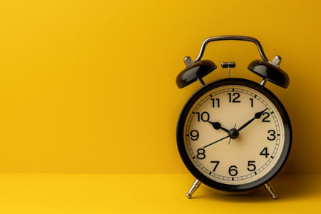 Black alarm clock on a yellow background.