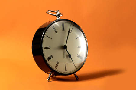 A portrait of a small old fashioned antique alarm clock with roman numbers on the dial on an orange background. The hands of the clock are pointing at a little past 5 o'clock.