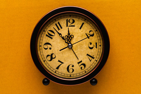 Golden vintage alarm clock showing five to twelve