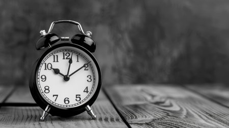 A vintage black and white alarm clock rests on a wooden table, evoking feelings of nostalgia and timelessness with its classic design and soft focus backdrop.