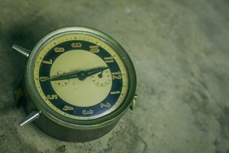 Old retro alarm clock on concrete vintage background.