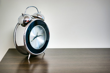 Vintage alarm clock on wood table.
