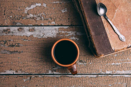 Coffee cup with saucer and spoon on vintage wood surface. Copyspace. Selective focus.