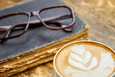 Coffee, old book and glasses. Latte with foam close up. Can coffee make you smarter.