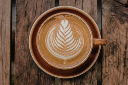 A cup of coffee with a beautiful latte art design on top, placed on a wooden table, captured from a top view.