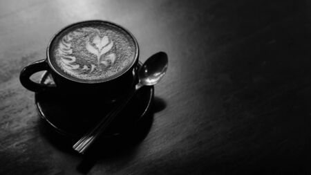 cup of coffee latte art on the wooden desk in coffee shop cafe with vintage color tone filter background