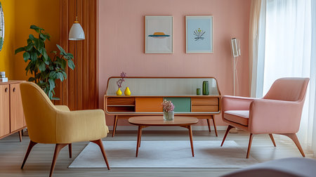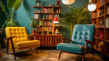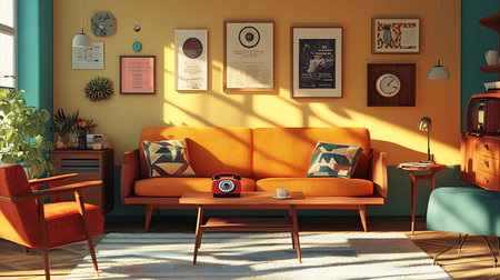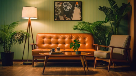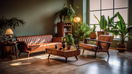 cozy retro room with classic mid-century furniture, wall art and throw pillows, created with generative ai