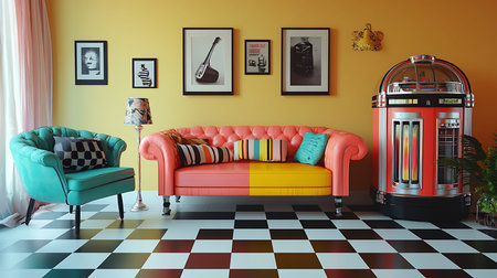 Explore a vibrant vintage living room featuring a jukebox colorful furniture and artistic decor.