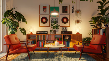 Explore a retro living room featuring vintage decor and warm colors, perfect for adding a touch of mid-century charm to any space. Cozy and inviting.