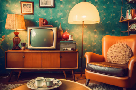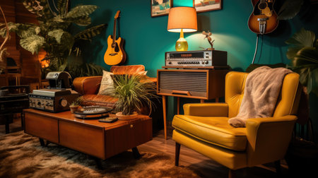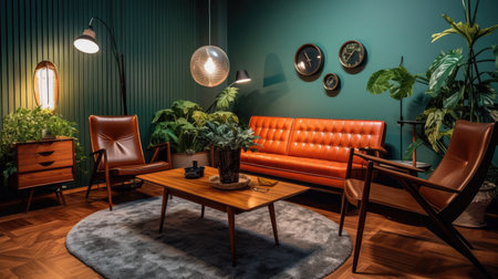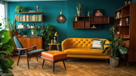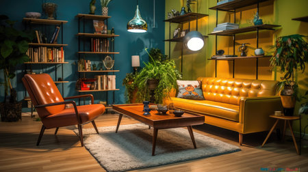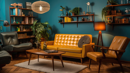 A retro-inspired living room with a focus on comfort and style, featuring a mix of vintage and modern pieces.Generative AI