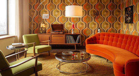 A stylish vintage living room featuring retro decor, patterned wallpaper, and natural light, perfect for showcasing cozy home aesthetics and furniture design.