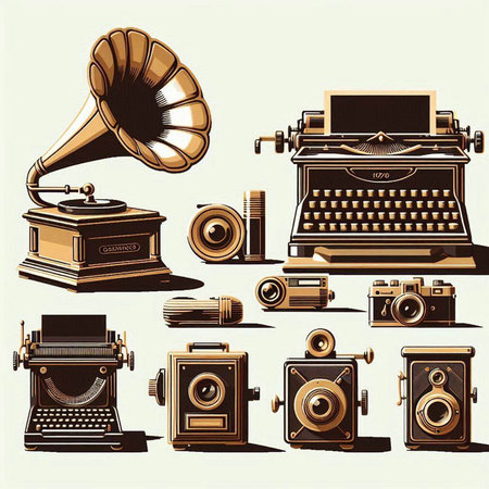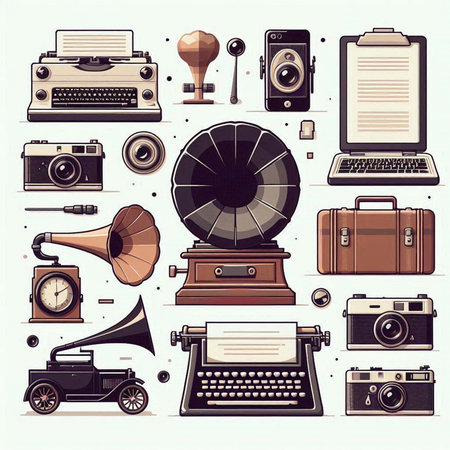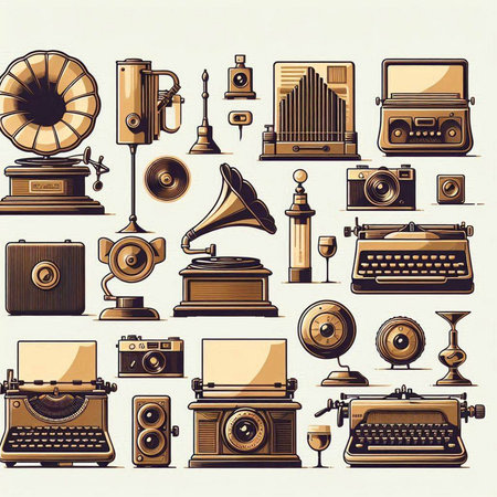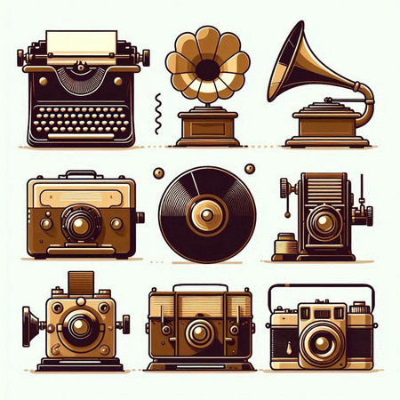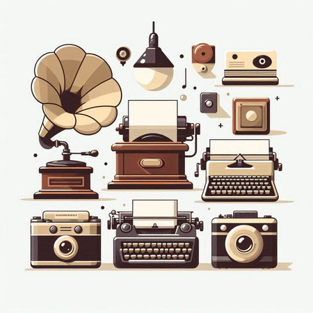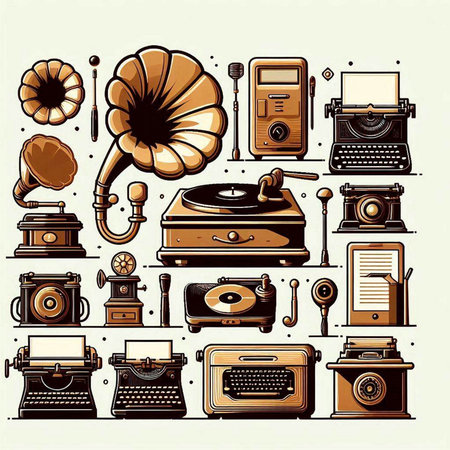 Retro icons set with typewriter, gramophone, record player and other objects
