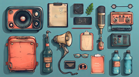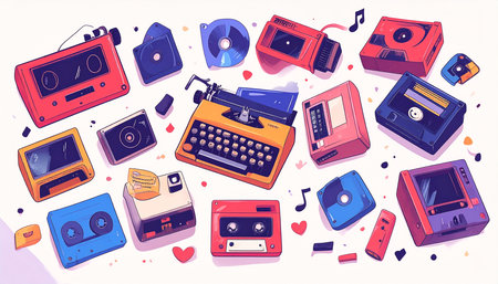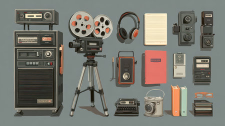 Retro style vector illustration with different types of media and objects.