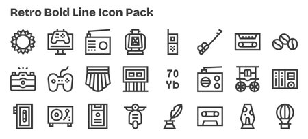 This collection features 24 Bold Outline-style icons tailored to the Retro theme, great for digital design.