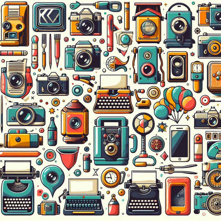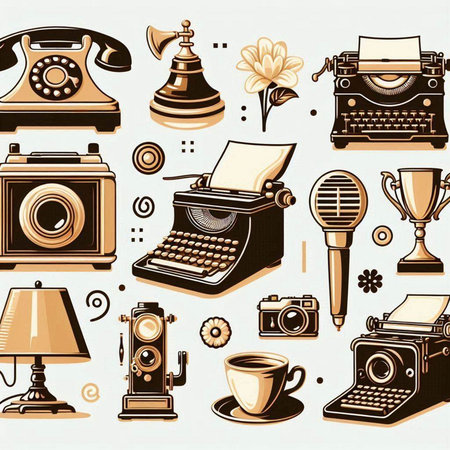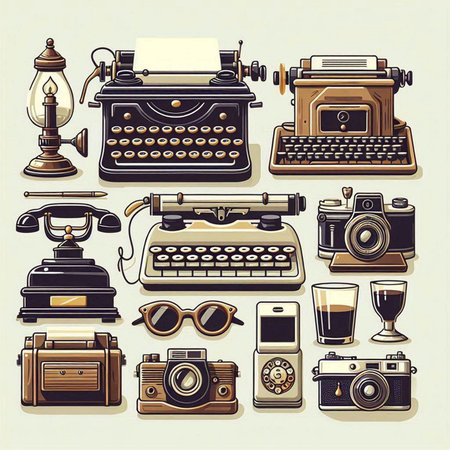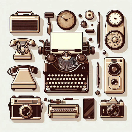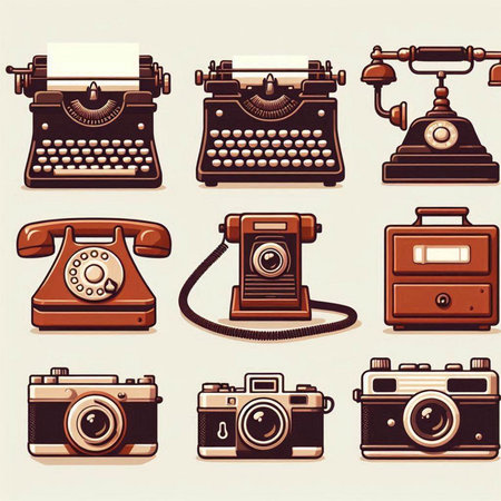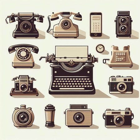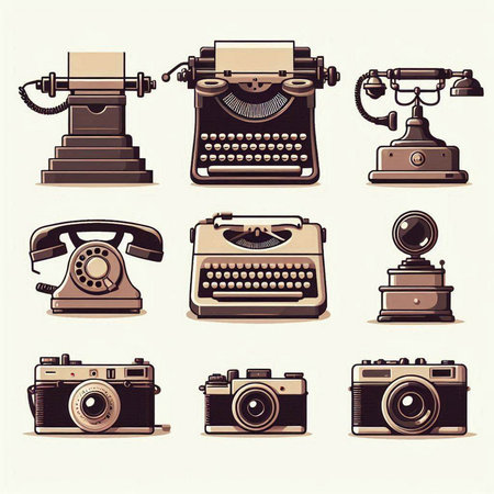 Retro icons set with typewriter, camera, telephone and other objects