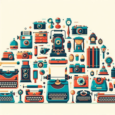 Vintage typewriter, camera, wristwatch and other vintage equipment. Vector illustration.