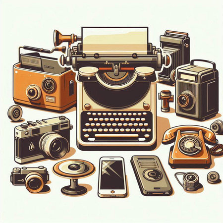 Vintage typewriter, camera, phone and glasses. Vector illustration.