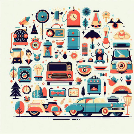 Colorful retro illustration featuring vintage elements such as cars, records, milkshakes, roller skates, pin-up girls, microphones, sunglasses, and more, evoking the nostalgic vibe of the 1950s and 1960s.