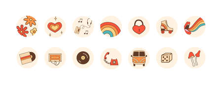 Hippie retro 60s 70s 80s highlights round icons set. Funky positive collection covers for social media insta blog. Vector flat cartoon style illustration