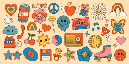 Groovy set hippie 70s. Cartoon flower rainbow peace Love heart daisy mushroom etc. Sticker pack in trendy retro style.