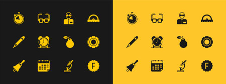Set Protractor grid School timetable Pear Microscope Alarm clock Teacher Stopwatch and Glasses icon. Vector.