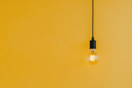 A warm light bulb hangs from a black cord, casting a soft glow against a bright yellow wall. The simplicity of the design creates a lively and inviting atmosphere.