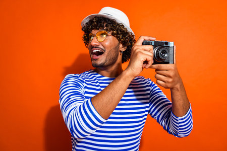 Cheerful young man in a sailor-striped shirt holding a vintage camera with excitement against an orange background