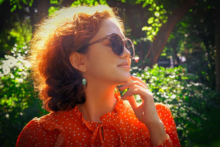 Asian girl in sunglasses looking up closeup of the face. She is posing in rays of bright sun in profile.