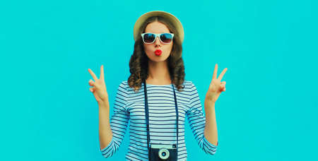 Summer portrait of young woman photographer blowing her lips sending air kiss with vintage film camera on colorful blue background