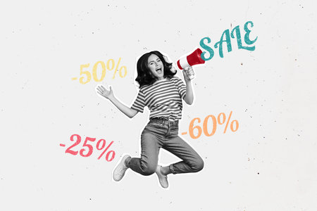 Creative banner poster collage of jumping girl speak loud speaker sales 50 25 60 percent on white background