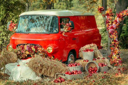 the fall in the garden of red apples in a basket and haystacks near the red bus