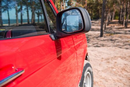 red car in forest with green trees in sunny day