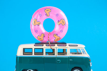 Retro van toy with inflatable pool float against blue background minimal creative travel and summer vacation concept.